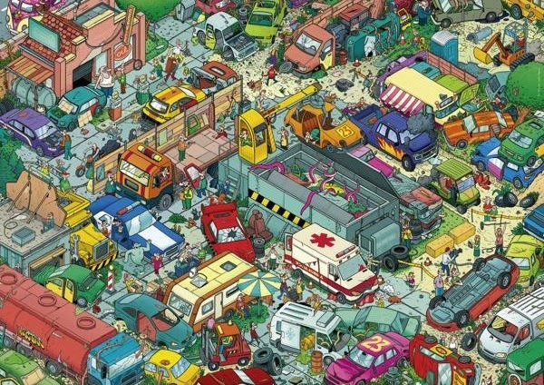 Puzzle 1000 pièces. Car Cemetery de la marque HEYE, Boîte triangulaire et de l'artiste Lectrr - Dimensions du puzzle monté : 50 cm x 70 cm