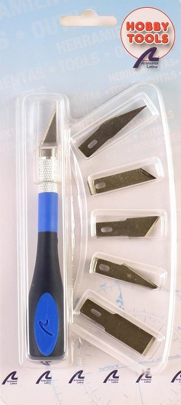 Cutter Nº 5 avec manche ergonomique et six lames -cinq différents- pour les tâches liées à la découpe de pièces de modèle ou d'autres petits objets. Cet outil de modélisme ou d'autres métiers tels que le travail du papier, du carton, du plastique et de l'électricité a le but suivant : il facilite la découpe avec une précision et un confort absolus. Construit en métal de haute qualité et en plastique renforcé pour plus de durabilité, le cutter comprend un capuchon de protection pour éviter les coupures lorsqu'il n'est pas utilisé.