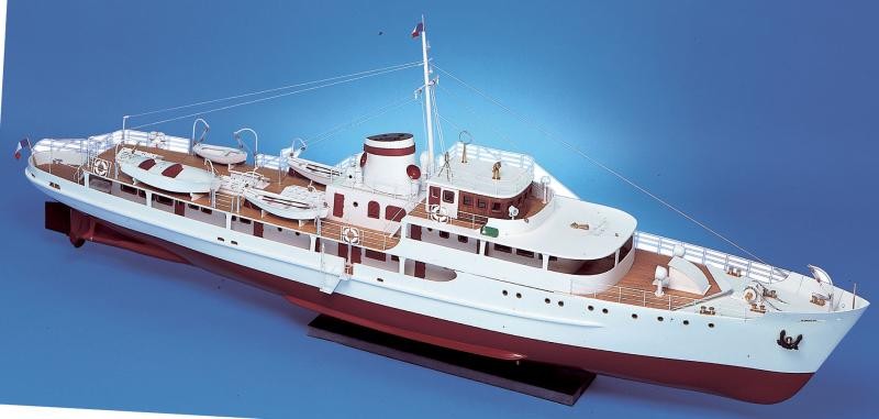Echelle 1/50ième longueur 1,25 m, largeur 0,18 m. Possibilité d'adapter aisément de nombreuses fonctions radiocommandées: Treuil, éclairage cabine, radar, fumigène, bruiteur, etc... Boîte comprenant blocs avant et arrière, cheminée, supports d'étambots préfabriqués, pont, quille, couples prédécoupés, pièces d'accastillage laiton et métal, 2 arbres d'hélice, 2 hélices, plan et instructions détaillés.