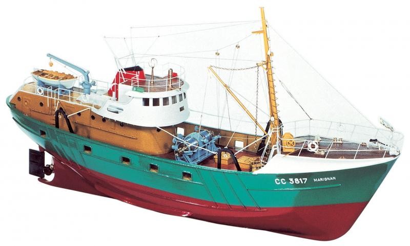 Maquette bateau bois d'un chalutier des grandes pêcheries de Lorient et Concarneau. Maquette navigante à l'échelle 1/33 ème, de longueur 0,90 m et de largeur 0,21 m du fabriquant New Cap Maquettes. La boîte de construction très complète comprend le bloc avant et arrière en bois massif et tous les couples en contre-plaqué prédécoupés. Son volume interne offre la possibilité d'implanter une propulsion "vapeur" ainsi que de nombreux asservissements électriques. Le tube d'étambot et son hélice, le plan détaillé à l'échelle et la notice de montage sont inclus. L'accastillage complémentaire fait l'objet d'une boîte séparée.