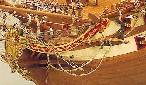 Magnifique vaisseau français de l'époque 1785 armé de 75 canons. Construction tout bois par couples et double bordé, pièces découpées au laser. Accastillage complet inclus dans la boîte comprenant poulies, caps de mouton en buis, canons en laiton, ancres, ornements, fil de gréement, figure de proue montée, etc. Plans très détaillés.