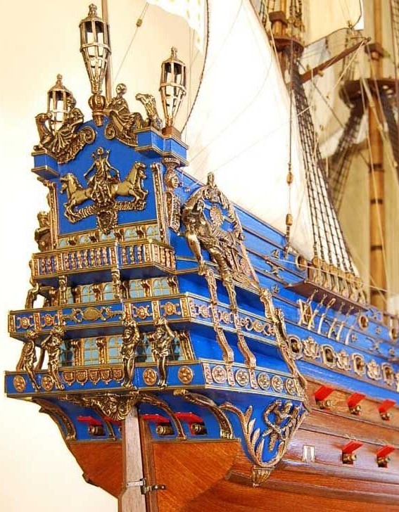 Le Soleil Royal avec son armement fastueux avec de nombreuses sculptures moulées en bronze, ses lanternes ciselées et dorées donnent au bateau un aspect majestueux.