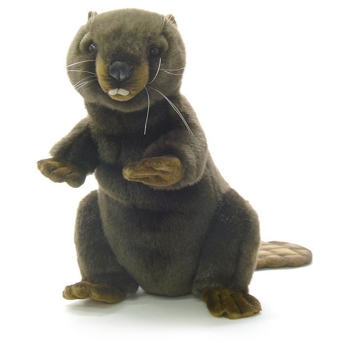 Voici un castor en peluche très réaliste qui tient sur ses deux pattes ! Il possède une longue queue plate, des petits yeux noirs, deux dents blanches et un pelage soyeux.